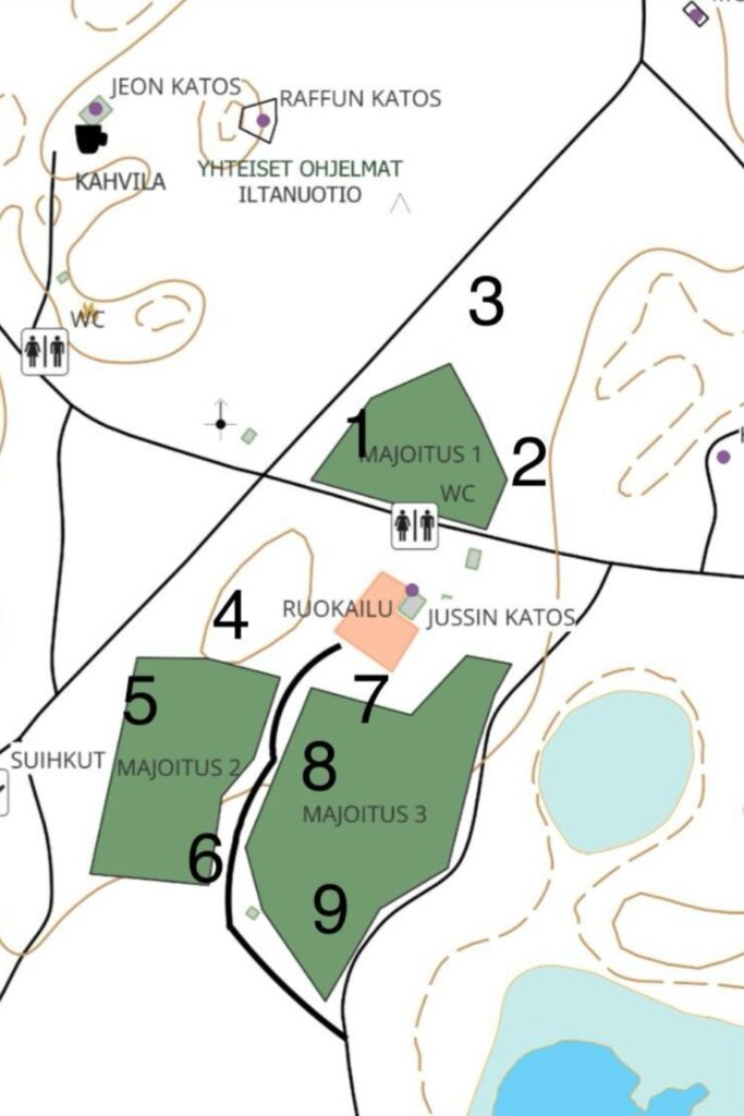 Majoitusalue A: Tammela (7), Jyväskylä (8), Helsinki (9)